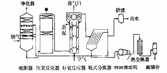 煙氣中的SO2通過水膜除塵器或吸收塔溶解于水并轉(zhuǎn)化為亞硫酸鹽、硫酸鹽;在厭氧環(huán)境及有外加碳源的條件下,硫酸鹽還原菌將亞硫酸鹽、硫酸鹽還原成硫化物;然后再在好氧條件下通過好氧微生物的作用將硫化物轉(zhuǎn)化為單質(zhì)硫,從而將硫從系統(tǒng)中去除?梢詫煔馍锩摿蜻^程劃分兩個(gè)階段,即SO2的吸收過程和含硫吸收液的生物脫硫過程。