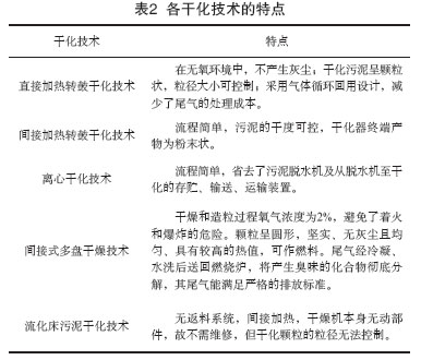 干化和干燥是污泥深度脫水的一種形式,其應(yīng)用的能量(推動(dòng)力)主要是熱能,即用熱能將污泥中的水汽化。污泥干化形式有傳統(tǒng)的自然干化和強(qiáng)化自然干化。干化、干燥技術(shù)主要有直接加熱轉(zhuǎn)鼓干化技術(shù)、間接加熱轉(zhuǎn)鼓干化技術(shù)、離心干化技術(shù)、間接式多盤干燥技術(shù)和流化床污泥干化技術(shù)。其特點(diǎn)見表2。