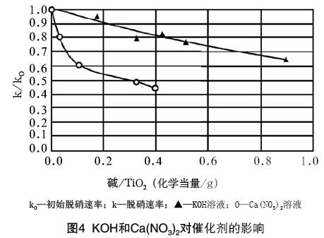 分別將催化劑浸漬在KOH和Ca(NO3)2液體中,在350℃的條件下進行脫硝實驗。得到這兩種物質(zhì)對催化劑的影響(見圖4)。