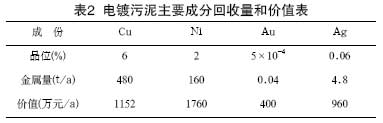 假定每年產生1萬t電鍍污泥,金屬回收率都以80%計,按目前市價Ni11萬元/t、Cu2.4萬元/t、Au100元/g、Ag2元/g計算,它們的產量、價值見表2。