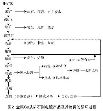 以銅礦石提煉Cu為例,按照銅礦石0.4%的工業(yè)開采品位,以當前的提煉技術,礦石經選礦、粗煉、精煉,總回收率最多為70%,480噸Cu需要開采約17.1萬噸銅礦石;鎳礦石工業(yè)開采品位為0.3%,則160噸Ni金屬需要開采7.2萬噸鎳礦石,兩項合計約為24.3萬噸,即若每年綜合利用1萬噸電鍍污泥,就可以少開采24.3萬噸礦石,這樣就可以降低礦石開采量,延長取代年限,節(jié)約自然資源,所以這是一項循環(huán)經濟的范例。金屬Cu從礦石到電鍍產品及其消費的循環(huán)方式,如圖2所示。