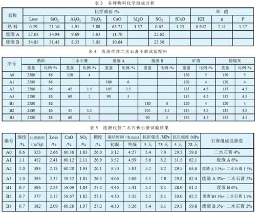 在實驗室利用水泥熟料、二水石膏與經(jīng)過不同溫度處理的電解錳廢渣A、B 進(jìn)行對比實驗,各種物料化學(xué)組成分析見表3;廢渣代替二水石膏小磨試驗配比見表4;試驗結(jié)果見表5。
