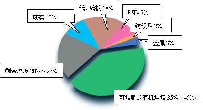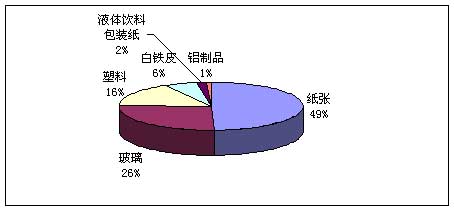 包裝品企業(yè)自愿根據(jù)使用包裝品的材質(zhì)、數(shù)量向該公司購買綠點標(biāo)志,該公司以出售綠點標(biāo)志獲得資金以用于組織對包裝垃圾的回收再利用。通過招標(biāo)形式,自行挑選合適的專門企業(yè)承擔(dān)包裝垃圾的收集、運輸、處理業(yè)務(wù)。2002年共回收利用包裝品、廢玻璃、廢紙垃圾1 110萬t,其中59%來自居民分類收集。具體組分如圖7所示。