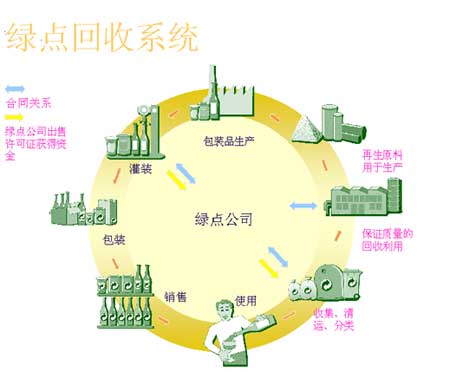 包裝垃圾、廢紙、廢玻璃的回收處理主要依據(jù)于德國的《包裝品回收處理辦法》,德國的社會生活工業(yè)化程度較高,此類垃圾產(chǎn)量快速上升,2002年包裝垃圾、廢紙、廢玻璃垃圾占生活垃圾總量的29%,近1 500萬t。因其主要成分為塑料、金屬、玻璃、紙張,可回收再利用價值較高,除紙張外其他物質(zhì)無法生物降解,采用填埋方式進行處理將永久占用大量土地資源,采用焚燒方法處理,其成分復(fù)雜性提高了廢氣、廢渣中有害物質(zhì)的比例,費效比很低。更重要的是包裝垃圾中原材料具有很高的重復(fù)利用價值。因此隨著德國社會環(huán)保意識的提高以及資源枯竭引發(fā)的威脅,促使德國率先(1991年)在世界上制定了《包裝品回收處理辦法》。在管理辦法中明確了包裝品的生產(chǎn)、使用企業(yè)、消費者應(yīng)對包裝垃圾回收、再利用承擔(dān)的責(zé)任和義務(wù),提出了每種包裝品材料必須達(dá)到的回收再利用率。在此基礎(chǔ)上,德國的包裝品生產(chǎn)、使用企業(yè)聯(lián)合成立了第二收運系統(tǒng)公司(相對于普通居民垃圾收運系統(tǒng)),其標(biāo)志為綠點,綠點回收系統(tǒng)的運作流程如圖6所示。
