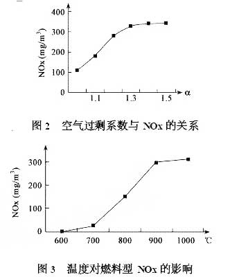 圖 2 說明,隨著空氣過剩系數(shù)的增大,NOx 的生成濃度顯著提高,由此可見,調(diào)整好空氣量是降低燃料型NOx 的一個重要操作因素。圖3 說明,燃料中的有機氮在900 ℃左右就開始分解氧化,并且很快達到極點,即使溫度繼續(xù)升高,NOx 的變化很小。燃料型NOx 的產(chǎn)生量主要決定于燃料中氮的含量和供風(fēng)量的多少,它對溫度的依賴性很小。
