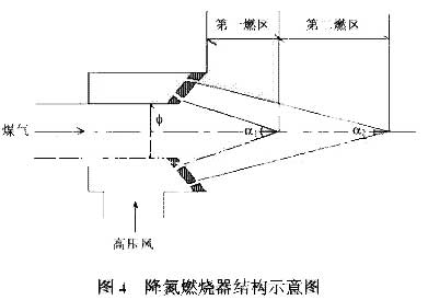 根據(jù)二次燃燒的原理設(shè)計出一種氣體降氮燃燒器,它的特點是不需要增加設(shè)備和改造爐膛,便可形成二次燃燒,其結(jié)構(gòu)和燃燒示意圖如圖4。