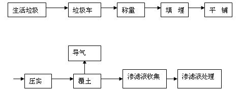 填埋處理是城市生活垃圾最基本的處理方法。它是將垃圾埋入地下,通過微生物長(zhǎng)期的分解作用,使之分解成無害的化合物。它分為簡(jiǎn)易填埋、衛(wèi)生填埋、壓縮填埋、破碎填埋四種方法。衛(wèi)生填埋是各國(guó)應(yīng)用的最普通的方法,其工藝流程見圖一。