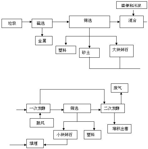 堆肥工藝是一種古老的有機(jī)固體廢物的生物處理技術(shù)。早在化肥廣泛使用于農(nóng)業(yè)之前,堆肥一直是農(nóng)業(yè)肥料的來源。該法是使垃圾糞便中的有機(jī)物,在微生物作用下,進(jìn)行生物化學(xué)反應(yīng),最后形成一種類似腐殖質(zhì)土壤的物質(zhì),用作肥料或改良土壤。根據(jù)堆肥原理,可分為厭氧法和好氧法兩種。厭氧分解需在嚴(yán)格缺氧條件下進(jìn)行,厭氧微生物分解生長(zhǎng)較慢,故應(yīng)用不多。但作為一種可持續(xù)發(fā)展的垃圾處理方法,這種處理方法預(yù)計(jì)會(huì)大幅度增加,F(xiàn)在,厭氧法已經(jīng)在越來越多國(guó)家的垃圾處理中扮演重要角色。好氧分解過程可同時(shí)產(chǎn)生高溫,可殺滅病蟲卵、細(xì)菌等。我國(guó)主要采用好氧分解法。其工藝流程如圖2.
