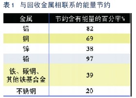 從廢品中回收這些物質(zhì)可節(jié)約大量能源。假如燃燒聚合物以回收它們的熱值,那么用于制造它們的能量將被浪費(fèi);假如以聚合物形式回收,那么用于制造它們的熱值(大部分塑料和橡膠的熱值在128 000千焦/千克和46 000千焦/千克之間)和能量將被保存。實(shí)際節(jié)約的能量將降低,因?yàn)閺膹U物流中回收物料要消耗能量。能量的節(jié)約依賴(lài)于分離和回收各種廢料所用的方法以及被回收物料的存在形式。廢料混合物越復(fù)雜,分離混合物所需能量越高。凈化回收的產(chǎn)品和除去回收物料中的污染物成本和能耗都比較高。與從礦石中生產(chǎn)金屬相比,回收金屬可節(jié)約能量如表1所示: