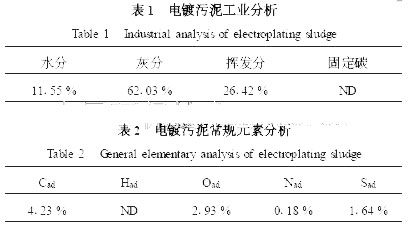 2.1 電鍍污泥的工業(yè)分析與元素分析結(jié)果試驗(yàn)所用物料來(lái)自杭州某工業(yè)廢物處理有限公司. 試驗(yàn)前,首先對(duì)原始電鍍污泥進(jìn)行工業(yè)分析與元素分析,分析結(jié)果分別見(jiàn)表1、表2 和表3. 由表1、表2 可知,原始電鍍污泥的水分、灰分都相當(dāng)高,其中,原始電鍍污泥樣品中水分占總重的50 %以上. 由表3 可知,電鍍污泥內(nèi)除含有Cr 、Zn、Cu、Pb、Ni 、Hg 等重金屬外,還有諸多Fe , Na , Mg , K, Ca 等元素. 其中的重金屬來(lái)自電鍍廢水,其它元素則是在處理電鍍廢水時(shí),由加入的次氯酸鈉、硫化鈉、硫酸亞鐵或氫氧化鈣等化學(xué)藥劑產(chǎn)生的(Jakob et al . , 1995) ,可見(jiàn)電鍍污泥不光金屬元素含量高,且成分相當(dāng)復(fù)雜.