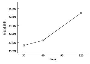 圖3 是在相同的溫度900 ℃下,不同焚燒時(shí)間的減重率曲線. 由圖可見(jiàn),隨著電鍍污泥在管式爐內(nèi)的焚燒時(shí)間超過(guò)60min 之后,減重率增加幅度有明顯的較大提高,通過(guò)分析知,這主要是由于電鍍污泥中一部分鹽在高溫時(shí)的分解造成的,同時(shí)結(jié)合后面關(guān)于重金屬析出的試驗(yàn)結(jié)果,與在溫度較低時(shí)基本不析出的高沸點(diǎn)重金屬元素如Zn ,Pb 等逐漸析出到空氣中也有一定的關(guān)系.
