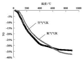 ![]() 圖4 空氣、N2 氣氛下電鍍污泥的TG曲線比較 |