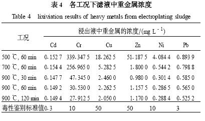 本文對(duì)不同氣氛情況下不同工況電鍍污泥在管式爐內(nèi)的焚燒灰渣作了進(jìn)一步探討,研究了溫度和焚燒時(shí)間對(duì)電鍍污泥中重金屬的浸出特性的影響.表4 是對(duì)5 種工況下的焚燒灰渣的浸出液的測(cè)定結(jié)果,浸出液中Cd、Cu、Ni 、Pb 的濃度都明顯低于國(guó)家浸出毒性鑒別標(biāo)準(zhǔn)值.