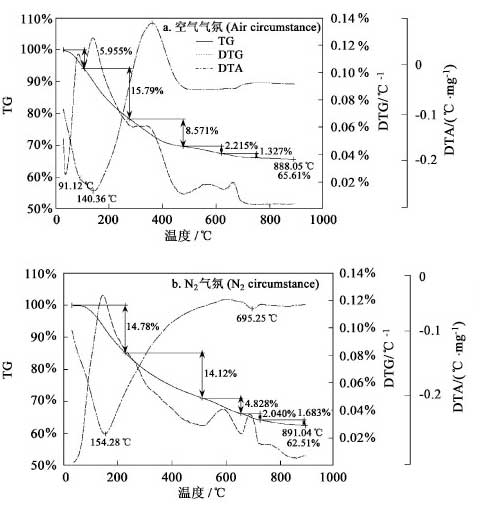 圖5 (a ,b) 分別是電鍍污泥在空氣和N2 氣氛下的熱重實(shí)驗(yàn)結(jié)果. 在熱重試驗(yàn)中, 空氣氣氛中的120 ℃~400 ℃溫度區(qū)間內(nèi)DTG曲線存在兩個(gè)明顯的失重峰,且有一定的重疊,而N2 氣氛中的相應(yīng)溫度區(qū)間內(nèi)只出現(xiàn)1 個(gè),這一現(xiàn)象可從DTA 曲線得到解釋. 空氣氣氛中該溫度區(qū)域內(nèi)有1 個(gè)吸熱峰和1 個(gè)放熱峰,分別在140 ℃和361 ℃;與此相反,N2 氣氛中該溫度區(qū)域內(nèi)只有1 個(gè)吸熱峰,在154 ℃. 這是電鍍污泥在空氣氣氛中發(fā)生了氧化反應(yīng),放出熱量;而由于在N2 氣氛中不存在放熱反應(yīng),只有物料升溫過(guò)程的吸熱,所以整個(gè)過(guò)程表現(xiàn)為吸熱反應(yīng).