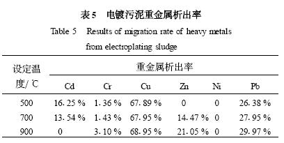由表5 可知,在6 種重金屬元素中,Ni 在各種試驗(yàn)工況下都沒(méi)有析出,是唯一沒(méi)有檢出的重金屬,Cr的析出率雖然隨著焚燒時(shí)間的增加而略有提高,但總的來(lái)說(shuō)Cr 的析出量還是相當(dāng)?shù)偷?這說(shuō)明這2 種重金屬是典型的不揮發(fā)性重金屬. 由于Cr6 + 的劇毒性,這一現(xiàn)象尤其要引起人們對(duì)電鍍污泥焚燒灰渣的重視. Zn、Cu 和Pb 的析出率變化規(guī)律比較接近,析出率隨著溫度的增高而增大. Zn 在500 ℃時(shí)析出率計(jì)算值為0 ,在溫度超過(guò)700 ℃之后析出率有所增加,說(shuō)明Zn 的開(kāi)始析出溫度范圍為500~700 ℃之間,這種規(guī)律也與Zn 元素在電鍍污泥的不同結(jié)合狀態(tài)有關(guān). Cd 是6 種元素中析出率最特殊的一種,Cd元素在500 ℃焚燒時(shí)的析出率最高為16125 % ,而隨著溫度升高,析出率呈減小趨勢(shì),在900 ℃時(shí)已經(jīng)為零,這是因?yàn)镃d 屬于半揮發(fā)性元素,當(dāng)反應(yīng)溫度升高后,Cd 與電鍍污泥內(nèi)的某些元素發(fā)生反應(yīng),例如S 和Cl 等,生成新的化合物,反而不易揮發(fā),更容易富集在渣中.
