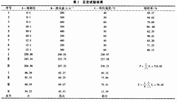 為了探索各種因素對(duì)脫硫率的影響,我們?cè)谠囼?yàn)室進(jìn)行了大量的試驗(yàn),確定液固比、鼓風(fēng)量、吸收溫度三個(gè)因素,各取三個(gè)水平進(jìn)行正交試驗(yàn)。試驗(yàn)數(shù)據(jù)、影響因素、水平見表2。