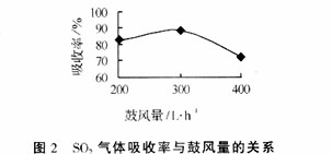 在液固比和吸收溫度不變的條件下,改變鼓風(fēng)量的實(shí)驗(yàn)結(jié)果如圖2。從圖2中SO2氣體吸收率與鼓風(fēng)量的關(guān)系可以看出,鼓風(fēng)量增加時(shí),吸收率有一 波峰值。說明鼓風(fēng)量在300L/h時(shí)吸收率較好。