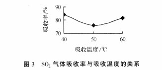 從圖3中SO2氣體吸收率與吸收溫度的關(guān)系可以看出,溫度由低到高變化時(shí),吸收率有一波谷值。這是因?yàn)橛密涘i礦漿吸收SO2,就物理溶解而言,溫度越低越好,而就氧化還原反應(yīng)來說,溶液的溫度升高反應(yīng)速度加快。綜合這兩個(gè)條件看,溫度在40℃是較理想的吸收溫度。