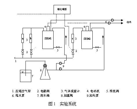 兩個(gè)直徑為19 cm 高40 cm的透明有機(jī)玻璃容器作為實(shí)驗(yàn)SBR反應(yīng)器。有效水深30 cm,因此有效容積為8.5 L。實(shí)驗(yàn)的活性污泥來(lái)源于城市污水處理廠的剩余污泥,經(jīng)半個(gè)月左右的馴化后用于正式實(shí)驗(yàn)。 反應(yīng)器內(nèi)平均活性污泥濃度3000mg/L左右。兩個(gè)反應(yīng)器平行工作,用以比較。曝氣系統(tǒng)由一組設(shè)在反應(yīng)器底部的微孔曝氣頭、空氣管道、可調(diào)式氣體流量計(jì)、電磁閥和氣源組成。電磁閥用以切換氣源(見(jiàn)圖1)。各反應(yīng)器設(shè)置一小型攪拌器,以47轉(zhuǎn)/分的慢速在反應(yīng)器的進(jìn)水階段及反應(yīng)階段對(duì)混合液進(jìn)行攪拌。