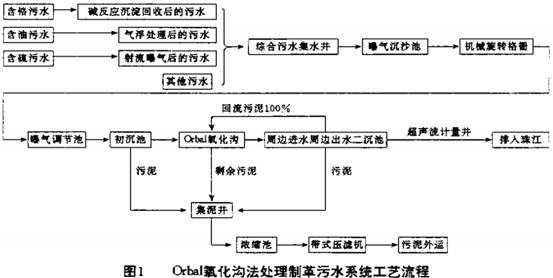 制革工藝中不同皮類(lèi)有不同的處理方法,其廢水的種類(lèi)及濃度都不同,根據(jù)這一特點(diǎn),我們對(duì)含鉻、含硫、含油污水分別收集進(jìn)行前處理,然后再匯入綜合污水進(jìn)入后處理綜合污水水質(zhì)為COD:2550mg/L,BOD:1300mg/L,pH:4~13,SS:1l50mg/L,NH3-N:70mg/L,S:6.14mg/L,Cr3+:18.27mg/L,油脂:463mg/1。整個(gè)污水處理系統(tǒng)工藝流程見(jiàn)圖l。