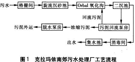 克拉瑪依南郊污水處理廠采用orbal氧化溝工藝處理城市生活污水及部分工業(yè)廢水。該污水廠于2002年8月14日正式運(yùn)行,工程實(shí)際總投資為1.89億元,占地10.34hm2,設(shè)計(jì)處理水量為10xl04m3/d。工藝流程見圖1。