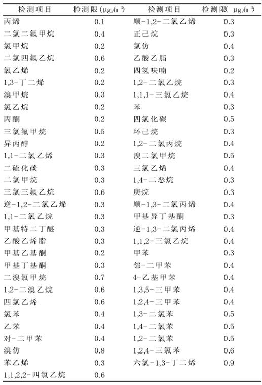 揮發(fā)性有機(jī)物(VOCs)是指在室溫下蒸汽壓>70.91Pa,且在空氣中沸點(diǎn)在260℃以下的有機(jī)物。一般包括烷烴、烯烴、炔烴、芳烴、酮、醇、醚、酯等以及部分含有N、O、S、鹵素等替代原子的有機(jī)物。本文主要討論USEPATO-15方法可檢出的揮發(fā)性有機(jī)物。VOCs的監(jiān)測(cè)方法采用USEPATO-15方法。采樣器使用美國(guó)Entech公司的一種帶限流孔的不銹鋼采樣罐,根據(jù)不同的限流孔可進(jìn)行最長(zhǎng)16h的連續(xù)采樣。采樣后將采樣罐密封,送實(shí)驗(yàn)室低溫保存,并于7d內(nèi)完成分析。由于多數(shù)情況下VOCs的濃度很低,需要對(duì)樣品進(jìn)行濃縮,采用美國(guó)Entech公司7100型VOCs預(yù)濃縮儀,對(duì)樣品進(jìn)行濃縮。然后經(jīng)色譜-質(zhì)譜聯(lián)用儀分離檢測(cè)。樣品定性通過VOCs混合物標(biāo)準(zhǔn)中各有機(jī)物的保留時(shí)間和譜庫(kù)中標(biāo)準(zhǔn)質(zhì)譜圖檢索來進(jìn)行;定量則使用峰高校正曲線進(jìn)行[2]。該方法可檢出102種化合物,但由于標(biāo)樣和檢出限的原因,目前上海市環(huán)境監(jiān)測(cè)中心能夠定量檢測(cè)的有59種(見表1)。