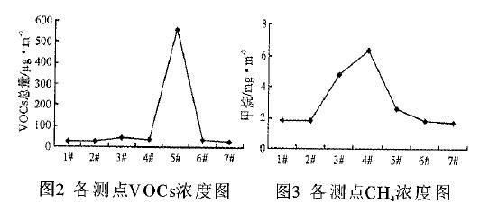 在監(jiān)測(cè)揮發(fā)性有機(jī)物的同時(shí),對(duì)甲烷濃度進(jìn)行了監(jiān)測(cè)見圖2、圖3。由揮發(fā)性有機(jī)物與甲烷的相關(guān)性分析可知:揮發(fā)性有機(jī)物濃度與甲烷的濃度的趨勢(shì)一致,可見垃圾填埋場(chǎng)檢出的揮發(fā)性有機(jī)物主要來源于垃圾降解過程。
