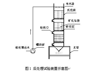 前處理試驗(yàn)裝置為電磁攪拌器、曝氣器。后處理試驗(yàn)裝置由進(jìn)水裝置、布水器、反應(yīng)床體、多孔隔板、廢水桶、蠕動(dòng)泵幾部分組成(如圖1)。