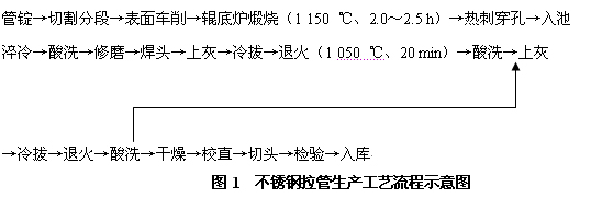 拉管加工工藝主要是將管錠或管徑、壁厚等不符合要求的管胚通過機(jī)械加工和表面處理的方式,將管錠毛胚管加工成標(biāo)準(zhǔn)規(guī)格的鋼管。拉管的過程其實就是圓管改徑、壁厚減薄的過程。不銹鋼拉管生產(chǎn)的主要工藝流程見圖1。