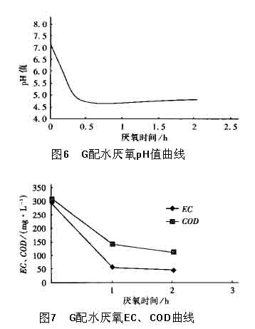 厭氧最初10 min內(nèi)糖水平激增顯然是由葡萄糖基質(zhì)被快速吸收進(jìn)入細(xì)胞所引起的。然而如果僅僅考慮糖元的緩慢分解則很難解釋此后內(nèi)糖的快速下降,因此推測(cè)存在某種比糖元更容易被迅速利用的糖類在厭氧初期被消耗,G配水下顯然就是吸收入細(xì)胞的葡萄糖發(fā)生酵解或轉(zhuǎn)化成其他非糖元的儲(chǔ)存物。試驗(yàn)從兩方面來驗(yàn)證這一推測(cè),首先G配水厭氧混合液pH值曲線(圖6)表明,厭氧最初15 min內(nèi)混合液pH值明顯降低,這說明確實(shí)發(fā)生了葡萄糖的酸性發(fā)酵。另外,同期測(cè)定的外糖(EC)與混合液COD曲線(圖7)顯示,整個(gè)厭氧過程中EC和COD并非同步下降,EC下降速率要大于COD降解速率,厭氧末EC濃度僅為41 mg/L而COD仍有108 mg/L。可見在厭氧過程中混合液COD組成成分在不斷變化,已經(jīng)不是完全由配水的葡萄糖組成,其中糖類成分逐漸減少而由其他物質(zhì)取代,這些組成COD的新物質(zhì)很可能就是被釋放到混合液中的糖酵解產(chǎn)物。