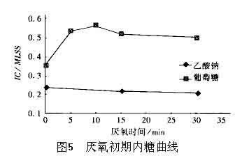 試驗(yàn)證明在厭氧飽食—好氧饑餓周期循環(huán)刺激條件下,對(duì)乙酸鈉、葡萄糖兩種基質(zhì)都能夠?qū)崿F(xiàn)有機(jī)物厭氧快速吸收。好氧饑餓5h前提下,乙酸鈉配水厭氧45min、葡萄糖配水厭氧30min時(shí),厭氧出水COD去除率均達(dá)80%以上,只是兩者馴化時(shí)間不同(試驗(yàn)中乙酸鈉配水馴化期為120d,葡萄糖配水則只需20d左右)。這一現(xiàn)象可從厭氧吸收能量來源的角度來解釋,即基質(zhì)的還原態(tài)不同,導(dǎo)致厭氧吸收的能量來源不同,乙酸鈉配水由于缺乏啟動(dòng)能源而需較長(zhǎng)的馴化期。一旦建立起以內(nèi)糖為能源的機(jī)制,兩種基質(zhì)的厭氧快速吸收效果并無明顯差別。