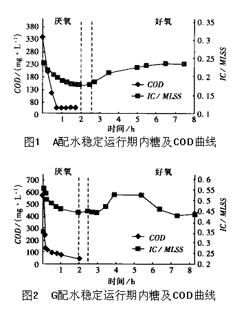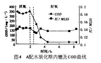 A配水中不含糖類成分,細(xì)胞吸收基質(zhì)進(jìn)入體內(nèi)不會(huì)對(duì)胞內(nèi)糖元的測(cè)定產(chǎn)生干擾。因此,該配水下的內(nèi)糖(IC)曲線與G配水相比,更能清晰地從糖元含量的角度反映細(xì)胞內(nèi)糖類物質(zhì)與非糖類物質(zhì)之間的轉(zhuǎn)化,表明以糖元為能量來源進(jìn)行厭氧快速吸收的真實(shí)內(nèi)糖變化規(guī)律。將A配水穩(wěn)定運(yùn)行期內(nèi)糖變化規(guī)律及同期測(cè)定的COD厭氧去除情況(見圖1)與A配水馴化期IC與COD曲線(圖4)用來對(duì)比細(xì)胞建立內(nèi)糖能源機(jī)制前后的IC變化及COD去除的特點(diǎn),可以看出馴化期基本沒有COD厭氧吸收,細(xì)胞內(nèi)糖也僅有小幅度變化,無明顯變化規(guī)律,IC/MLSS水平較低(為0.13~0.14);穩(wěn)定運(yùn)行期的混合液COD在厭氧段迅速下降,細(xì)胞內(nèi)糖含量伴隨這一過程而降低,即糖元分解并在隨后的好氧段重新合成,內(nèi)糖水平得到恢復(fù),IC/MLSS高于馴化期(為0.25~0.33)。另外,曲線表明糖元的分解與合成都較為緩慢。