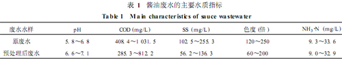 近些年來(lái),隨著人們生活水平的提高,醬油制造工業(yè)快速發(fā)展,導(dǎo)致醬油生產(chǎn)廢水排放量大增。有研究表明,醬油制造過(guò)程產(chǎn)生廢水約6~9t/t醬油。這類(lèi)廢水的主要成分包括糧食殘留物、發(fā)酵過(guò)程產(chǎn)物、醬油色素、消毒劑、大量的鹽分、各種微生物及其分泌物和代謝產(chǎn)物,具有色度大,BOD、COD和SS濃度較高等特點(diǎn)。雖然其BOD/COD值一般大于015,可生化性好,但是由于醬油的生產(chǎn)原料如大豆、麥麩等在長(zhǎng)時(shí)間的發(fā)酵過(guò)程中會(huì)通過(guò)酶褐變、非酶褐變反應(yīng)生成各種帶色物質(zhì),使得廢水的色度構(gòu)成極其復(fù)雜,采用單一好氧生物處理工藝很難達(dá)標(biāo)。因此,尋求處理效率高,流程簡(jiǎn)單的處理方法以實(shí)現(xiàn)醬油廢水的脫色和有效降解是該廢水處理的研究熱點(diǎn)。