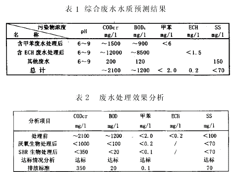 2生產(chǎn)工藝過程簡介 擬建項目工藝流程主要由醚化、蒸發(fā)①、閉環(huán)、蒸發(fā)②、旋液分離、精制、蒸發(fā)③、旋液分離和超濾、水洗、蒸發(fā)④、包裝等工段組成。主要過程如下: ⑴BPA與ECH在催化劑作用下醚化反應后,經(jīng)真空薄膜蒸發(fā)器蒸發(fā)、冷凍鹽水冷凝器回收ECH,尾氣采用水吸收塔吸收后排放,尾吸塔含ECH的廢水待集中處理。 ⑵醚化后中間體氯醇醚在負壓條件下滴加復合堿液,在催化劑的作用下閉環(huán),反應過程中蒸出的含EDH的水經(jīng)冷凝后作為廢水待集中處理,閉環(huán)產(chǎn)物經(jīng)旋液分離器分離結(jié)晶NaCL,后送精制工段,分離出的鹽渣因含樹脂,送鹽處理工序處理。 ⑶精制工序用甲苯作為溶劑,滴加復合堿液,反應完畢后過量堿用鹽酸中和。采用薄膜蒸發(fā)器蒸發(fā)提留、冷凍鹽水冷凝器回收甲苯,分離出的含甲苯廢水集中待處理。蒸發(fā)后大部分NaCL從樹脂液中結(jié)晶出來,通過旋液分離和超濾分離出鹽渣送鹽處理工序處理。回收的甲苯作為溶劑送鹽處理工序洗滌鹽渣。 ⑷精制后的樹脂液經(jīng)去離子水的兩次洗滌分離,除去樹脂中殘留的NaCL,甲苯、丙三醇、催化劑等雜質(zhì)后,再蒸發(fā)脫除水份送到包裝工序。 ⑸鹽處理:采用回收甲苯多次洗滌鹽渣,經(jīng)自動真空離心機分離的鹽,再經(jīng)真空耙式干燥機脫甲苯,得到符合氯堿工業(yè)要求的NaCL。洗滌后含樹脂的甲苯溶液返回精制工段。處理過程中產(chǎn)生的甲苯氣體用管道并入甲苯回收冷凝系統(tǒng)。 3廢水的污染與防治 3.1廢水污染源分析 根據(jù)工程分析,樹脂生產(chǎn)過程中產(chǎn)生的廢水,主要有工藝冷凝吸收廢水(包括含ECH廢水、含甲苯廢水)、樹脂洗滌廢水(含甲苯及其它有機物)、設備地坪沖洗水、生活污水以及循環(huán)冷卻水系統(tǒng)置換排水。與傳統(tǒng)工藝不同的是,工藝過程中產(chǎn)生的絕大部分氯化鈉被結(jié)晶分離出來,水中污染物主要為甲苯、ECH、丙三醇有機物、懸浮物及少量氯化鈉等。噸產(chǎn)品排放綜合廢水約為4m3。 3.2廢水處理方案 含甲苯廢水在靜置分離粗甲苯后經(jīng)氣浮去除其中的懸浮有機物,送活性炭吸收塔吸收脫除甲苯后,與含ECH廢水經(jīng)熱力水解后的出水匯集,用生活污水及設備、地坪沖洗水調(diào)配,經(jīng)厭氧、好氧生物氧化后達標排放。具體流程可見圖1。 4廢水處理技術可行性分析 4.1含甲苯廢水的處理 根據(jù)甲苯在水中的溶解度小、靜置易分層的特點,采用靜置分層后分離的方法既可以回收粗甲苯,又可以降低廢水中的甲苯濃度。分離出粗甲苯經(jīng)提餾可回收精甲苯;廢水中的甲苯濃度降至560-570mg/l,。由于高濃度甲苯廢水的可生化性較差,不易被生化降解,需采用活性炭吸附塔吸附脫除甲苯。甲苯脫除效率以9%:計,廢水中的甲苯濃度可降低到6mg/l,以下,送生化處理裝置處理。為保證活性炭吸附塔吸附效率,在廢水進吸附塔前加設一氣浮裝置,浮選去除廢水中的有機雜質(zhì)和膠體物質(zhì)。失去活性的含甲苯的活性炭,其主要元素成分為C、H、O;等,送鍋爐房摻入煤中燒掉,不會造成二次污染。 4.2含ECH廢水的處理 由于ECH為難生物降解的有毒化學物質(zhì),直接采用生化處理脫除率低。為保證生化處理裝置的處理效率,可利用ECH水解反應生成易生物降解的化學物質(zhì)—丙三醇的化學反應原理,在堿性條件下,采用熱力水解法將ECH轉(zhuǎn)化為丙三醇,轉(zhuǎn)化率〉99%以上。廢水經(jīng)中和后,再經(jīng)厭氧生化、SBR處理裝置處理。 4.3生化處理工藝分析 4.3.1厭氧處理 由于廢水中的CODcr濃度較高,大于2000mg/l,且含有較高濃度的甘油物質(zhì),需經(jīng)過厭氧生物處理使之降解。廢水中的甘油在微生物的作用下,先轉(zhuǎn)化為磷酸甘油醛S,然后再轉(zhuǎn)化成為丙酮酸,并進入丙酮酸代謝途徑,厭氧生化處理后的廢水再經(jīng)SBR生化法進一步處理。 4.3.2SBR處理工藝分析 序批式間歇活性污泥法(簡稱SBR),是近年來應用日趨廣泛的一種污水生物處理新技術,作為一種廢水處理工藝,兼均化、初沉、生物降解等功能,無污泥回流系統(tǒng),具有如下優(yōu)點:①生化反應推動力大,效率高,可多池串聯(lián)或并聯(lián)組合,運行靈活;②集曝氣、沉淀、排水各種功能于一池,工藝簡潔,布置緊湊,能較大幅度降低能耗和減少占地面積;③污泥不易膨脹、泥齡長,沉降性能好,剩余污泥量少,僅為普通曝氣工藝的50%;④耐沖擊負荷,處理能力強,運行操作較為靈活,曝氣、沉淀時間可根據(jù)水質(zhì)情況進行調(diào)整,保證了出水水質(zhì);⑤脫氮除磷效果明顯;⑥集厭氧(缺氧)和耗氧兩類特征各異的微生物于一體,裝置結(jié)構(gòu)簡單、造價低,設備費、運行管理費用低。4.4廢水處理預期效果(見表1、表2) 4.5.1膜技術的利用 含甘油廢水可用反滲透膜技術處理,使用較多的是醋酸纖維素膜。用不對稱的醋酸丁酯纖維素及醋酸纖維素反滲透管狀膜,可以從石化廢水中分出甘油,在4.2-5.6MPa壓力下操作,其選擇性最好;采用多級反滲透裝置,并以對流湍流式進水,則可回收31%以上的甘油,從水中除去92%以上的無機鹽,出水再用生化法處理。 4.5.2化學氧化法 含甘油廢水可用臭氧處理,其氧化產(chǎn)物均可被生化氧化。在紫外光照的催化下,可加速臭氧氧化反應的進行,甘油的分解速率能得到大大的增加
