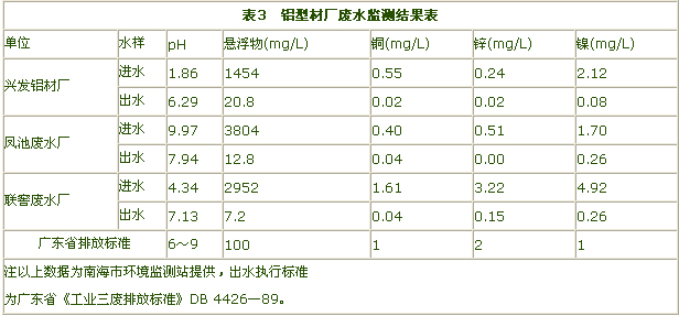該鋁型材廢水處理工藝已在南海市90%以上的鋁材廠投入運行使用,設(shè)備運轉(zhuǎn)良好,出水水質(zhì)穩(wěn)定。表3為部分企業(yè)取樣監(jiān)測結(jié)果。
