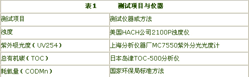 分別將涂鋁砂和石英砂裝入濾料高度為70cm的兩個(gè)濾柱中,不投加任何混凝劑,采用等水頭減速過(guò)濾進(jìn)行微污染原水的直接過(guò)濾對(duì)比實(shí)驗(yàn)。測(cè)試項(xiàng)目與儀器見(jiàn)表1。