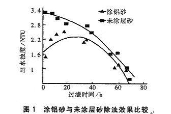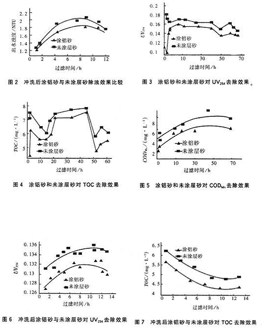 ② 濁度為20 NTU左右的微污染原水,可用氧化鋁涂層砂直接過(guò)濾,不需投加任何混凝劑。原水中的懸浮雜質(zhì)和微量溶解性有機(jī)物可同時(shí)被不同程度地去除。實(shí)驗(yàn)證明,涂鋁砂的除濁和去除有機(jī)物的效果顯著優(yōu)于未涂層砂。