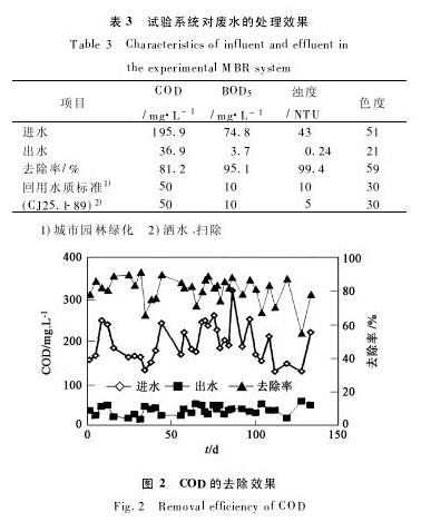 (2)膜生物反應(yīng)器中難降解有機(jī)物呈明顯的積累狀況,但出水COD濃度未受影響,微濾膜以及凝膠層在膜表面形成動(dòng)態(tài)過(guò)濾層的分離作用對(duì)穩(wěn)定出水水質(zhì)起了重要的作用。
