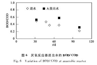 圖6是進(jìn)入?yún)捬醴磻?yīng)器的毛紡印染廢水(進(jìn)水)和厭氧反應(yīng)器出水(A段出水)中BOD/COD的測(cè)試結(jié)果。圖5中所示的系統(tǒng)在70~100d區(qū)段內(nèi)上清液COD的回落現(xiàn)象可能與進(jìn)入MBR的廢水較好的可降解性能有關(guān),這一階段的BOD/COD達(dá)到0157。在系統(tǒng)運(yùn)行100d以后上清液COD又呈急劇的上升趨勢(shì),這一階段進(jìn)入MBR的廢水的降解性能明顯低于70~100d區(qū)段,BOD/COD比值僅為0131。因此MBR處理難降解工業(yè)廢水時(shí),必須控制合適的污泥齡,適當(dāng)?shù)呐拍嘤兄诮档蜕锓磻?yīng)器中溶解性難降解有機(jī)物質(zhì)的積累。