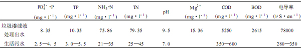 垃圾滲濾液取自重慶長(zhǎng)生橋垃圾處理場(chǎng),經(jīng)磷酸銨鎂沉淀法處理,取垃圾滲濾液的處理出水,生活污水取自重慶大學(xué)校園宿舍生活污水。垃圾滲濾液處理出水和生活污水的水質(zhì)為: