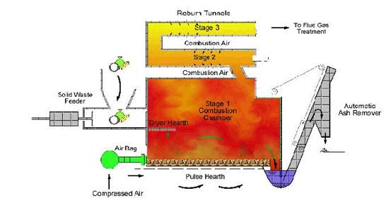 垃圾入爐焚燒前不需進行任何預(yù)處理。生活垃圾經(jīng)自動給料機送入焚燒爐干燥爐爐排架上干燥、熱解,在干燥爐架上,接受主爐膛中的輻射熱后,蒸發(fā)出垃圾中的水分,使生活垃圾更加容易燃燒。此階段(干燥熱解氣化段)控制燃燒空氣量,供氧量不足。同時部分垃圾在高溫輻射作用下,開始進行化學(xué)分解,其中的部分高分子烴類和一氧化碳等可燃物揮發(fā)出來,干燥爐排處溫度控制在500℃~600℃左右,這樣就有了最佳的熱分解溫度,可以達到最好的分解效果,由于引風(fēng)機的作用,部分氣體在主爐膛內(nèi)的停留時間很短,只有1~2秒鐘,由于氧氣供應(yīng)并不充分,只有25%的碳氫化合物在主爐膛燃盡,15%的固定碳在爐排燃盡,其余60%左右的揮發(fā)性碳氫化合物進入再燃室。烘干后進入第一級爐排,在爐床上經(jīng)熱解產(chǎn)生出的揮發(fā)性物質(zhì)和可燃物在高溫下燃燒。垃圾燃燒剩余的固體物留置在爐排上,通過與空氣的劇烈混合和爐排的拋動,垃圾被拋入下一級爐排繼續(xù)燃燒,脈沖焚燒爐排級數(shù)依據(jù)設(shè)計而定。直至進入最后一級爐排燃燒時,噴入的空氣量使廢料完全燃盡后,進入灰渣坑,由自動除渣裝置排出。此時就整個焚燒爐爐膛與再燃室接口狀態(tài)看,空氣、燃料顆粒、揮發(fā)分略呈不完全燃燒狀態(tài)由于各級爐排的燃燒強度和燃燒廢物量不一樣,所需的空氣量不同,因此每層爐排的振動頻率和擺動幅度也不一樣,完全視現(xiàn)場工藝情況來調(diào)整計算機控制,準(zhǔn)確性高。根據(jù)燃燒特點和傳熱方式的不同,可分為三個階段: