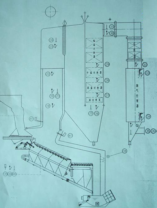 燃燒用的空氣取自(垃圾池是密封)垃圾貯坑的上方,由鼓風(fēng)機抽吸和壓送進行二級加熱,第一級為蒸汽暖風(fēng)機,第二級為煙氣暖風(fēng)機,風(fēng)溫提高到250℃左右,然后分成一次風(fēng)和二次風(fēng),一次風(fēng)進入到爐排下方的公共風(fēng)室,通過各風(fēng)室風(fēng)門的調(diào)節(jié),獲得最佳的風(fēng)量分配,最后經(jīng)爐條的風(fēng)道穿過垃圾層進入爐膛,提供垃圾焚燒所需的氧量;二次風(fēng)通過二次風(fēng)風(fēng)道經(jīng)調(diào)節(jié)風(fēng)門從燃燒室上方前、后拱處的兩排噴嘴噴射進爐膛,對燃燒氣進行擾動和補充氧量,達到充分燃燒的目的。燃燒空氣從垃圾貯坑抽取是為了將這些被污染帶有惡臭的空氣送入爐內(nèi)進行高溫處理,并維持垃圾貯坑的負壓狀態(tài),避免其外逸而造成周圍環(huán)境的污染。垃圾燃燒產(chǎn)生的高溫?zé)煔庠谝L(fēng)機的抽吸下首先通過鍋爐第一通道,第一通道水冷壁下部用耐火材料敷設(shè)有相當(dāng)長的衛(wèi)燃帶,用以減緩熱交換的速度,使在此區(qū)域內(nèi)的煙氣溫度保持著不低于850℃,有利于二惡英最大限度的分解。敷設(shè)衛(wèi)燃帶還可避免水冷壁裸露在高溫?zé)煔庵卸a(chǎn)生的高溫腐蝕。煙氣經(jīng)凝渣管從上而下通過第二通道,采用輻射傳熱進行熱交換,再急轉(zhuǎn)進入滿布對流受熱面的第三通道和第四通道,加快了熱交換的速度,在鍋爐出口處煙溫降至380℃左右。隨后通過布置有管式煙氣暖風(fēng)機的第五通道,與空氣進行最后的熱交換,被冷卻到270℃左右。為了保證靜電除塵器入口的煙氣溫度穩(wěn)定在設(shè)定的溫度值,鍋爐的第四通道設(shè)有旁路煙道和調(diào)節(jié)擋板,通過調(diào)節(jié)流經(jīng)第四通道的煙氣量來控制進入除塵器入口的煙溫。完成熱交換后的煙氣進入煙氣處理系統(tǒng)。