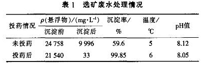 ②工業(yè)性試驗(yàn)。選用的陰離子型聚丙烯酰胺相對(duì)分子質(zhì)量為70萬800萬,質(zhì)量分?jǐn)?shù)為0.1%.用量為2.3g/m。在實(shí)際運(yùn)行中,當(dāng)原水懸浮物的質(zhì)量濃度為21540mg/L,pH=8.05,溫度6oC時(shí),投加陰離子型聚丙烯酰胺后.出水懸浮物的質(zhì)量濃度為33mg/L.去除率可達(dá)99.85%。