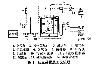 廢水經(jīng)由進(jìn)水泵從水箱中提升進(jìn)入反應(yīng)器底部,經(jīng)反應(yīng)后從出水口進(jìn)到沉淀池中,沉淀后的上清液排走,污泥則經(jīng)污泥泵回流進(jìn)入反應(yīng)器底部?諝馔ㄟ^氣泵,經(jīng)氣體流量計控制氣量后進(jìn)入反應(yīng)器。反應(yīng)器置于恒溫水浴[(35±1) ℃]中。試驗中采用了pH在線控制,通過自動投加Na2CO3溶液將pH值控制在7.0~7.8。