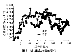 從圖5可以看出,反應(yīng)器中DO濃度主要控制在兩個水平,即在第121天以前反應(yīng)器內(nèi)DO為1mg/L左右,從第122~141天則主要控制在2mg/L左右。進(jìn)、出水總氮的變化見圖6。