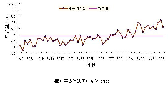 氣溫分布 2008年年平均氣溫9.6℃,較常年偏高0.7℃,為1951年以來第7個最暖年,也是連續(xù)第12年偏高。全國大部地區(qū)氣溫偏高或接近常年,其中東北中北部及內(nèi)蒙古東部、新疆北部和東部等地偏高1~2℃。除廣西較常年偏低,廣東、海南接近常年外,其余各省(直轄市、自治區(qū))年平均氣溫均較常年偏高,其中黑龍江年平均氣溫達歷史次高值。