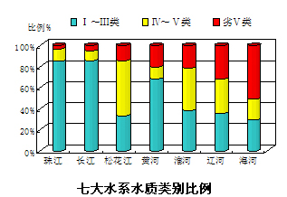 長(zhǎng)江、黃河、珠江、松花江、淮河、海河和遼河七大水系水質(zhì)總體與上年持平。200條河流409個(gè)斷面中,Ⅰ~Ⅲ類、Ⅳ~Ⅴ類和劣Ⅴ類水質(zhì)的斷面比例分別為55.0%、24.2%和20.8%。其中,珠江、長(zhǎng)江水質(zhì)總體良好,松花江為輕度污染,黃河、淮河、遼河為中度污染,海河為重度污染。