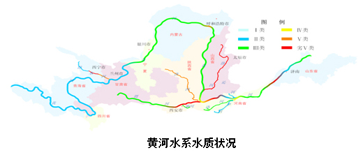 黃河水系 水質(zhì)總體為中度污染。44個(gè)地表水國(guó)控監(jiān)測(cè)斷面中,Ⅱ~Ⅲ類、Ⅳ類、Ⅴ類和劣Ⅴ類水質(zhì)的斷面比例分別為68.2%、4.5%、6.8%和20.5%。主要污染指標(biāo)為氨氮、石油類和五日生化需氧量。