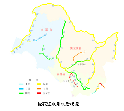 松花江水系 水質(zhì)總體為輕度污染。42個(gè)地表水國(guó)控監(jiān)測(cè)斷面中,Ⅰ~Ⅲ類、Ⅳ類、Ⅴ類和劣Ⅴ類水質(zhì)的斷面比例分別為33.3%、45.2%、7.2%和14.3%。主要污染指標(biāo)為高錳酸鹽指數(shù)、石油類和五日生化需氧量。