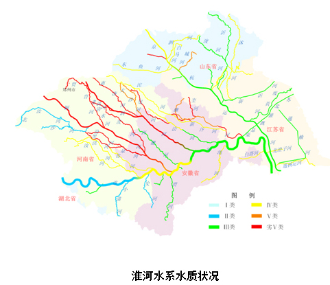 淮河水系 水質(zhì)總體為中度污染。86個(gè)斷面中,Ⅱ~Ⅲ類、Ⅳ類、Ⅴ類和劣Ⅴ類水質(zhì)斷面比例分別為38.4%、33.7%、5.8%和22.1%。主要污染指標(biāo)為高錳酸鹽指數(shù)、五日生化需氧量和氨氮。